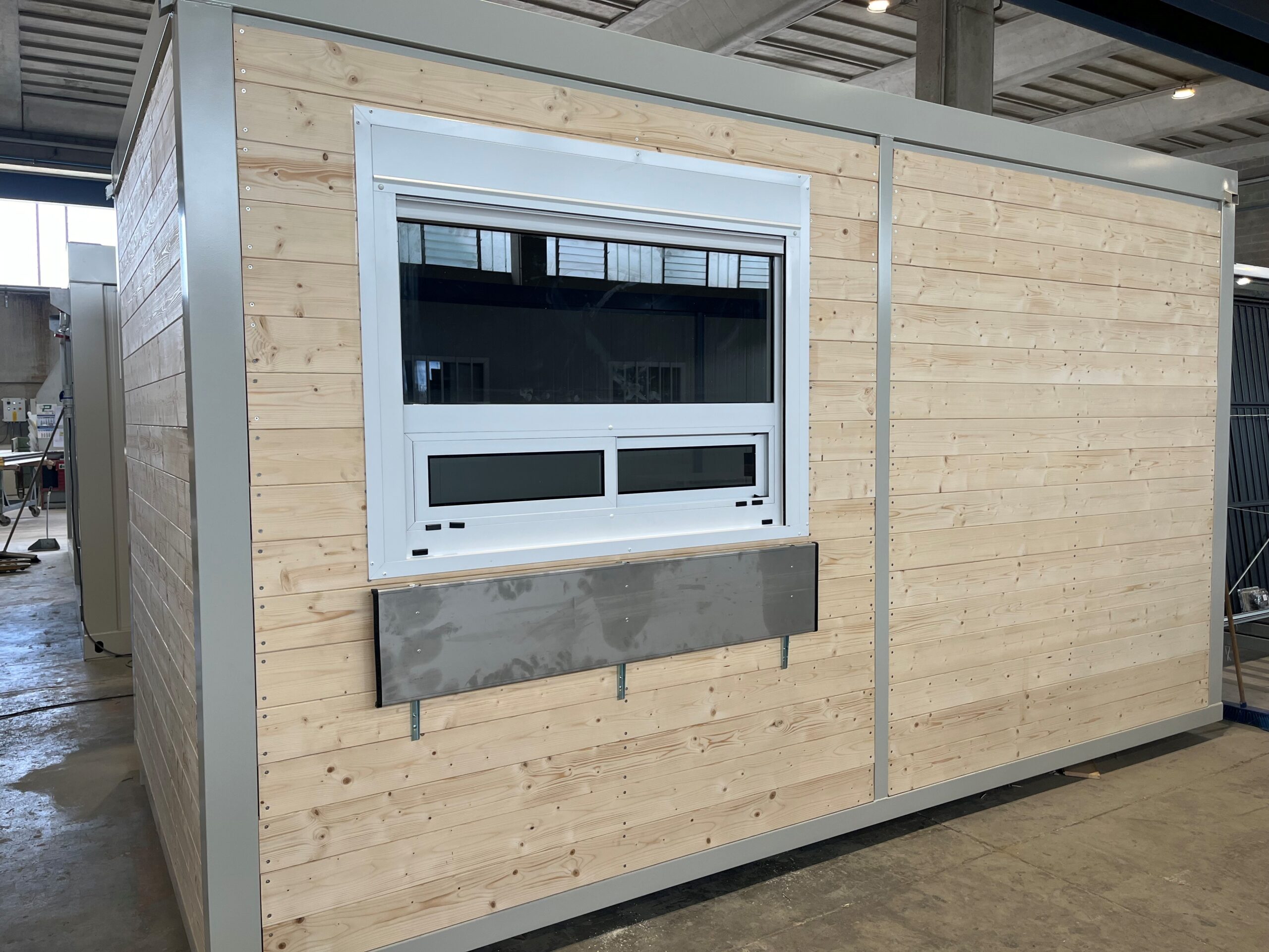 Il rivestimento in perline di abete applicato esternamente ai pannelli coibentati dona al box l’aspetto di una casetta in legno, mantenendo però la struttura metallica interna. Le doghe orizzontali, in tonalità “noce chiaro” o similari, creano un effetto caldo e naturale, ideale per giardini, contesti turistici e ambienti dove l’impatto estetico è prioritario.